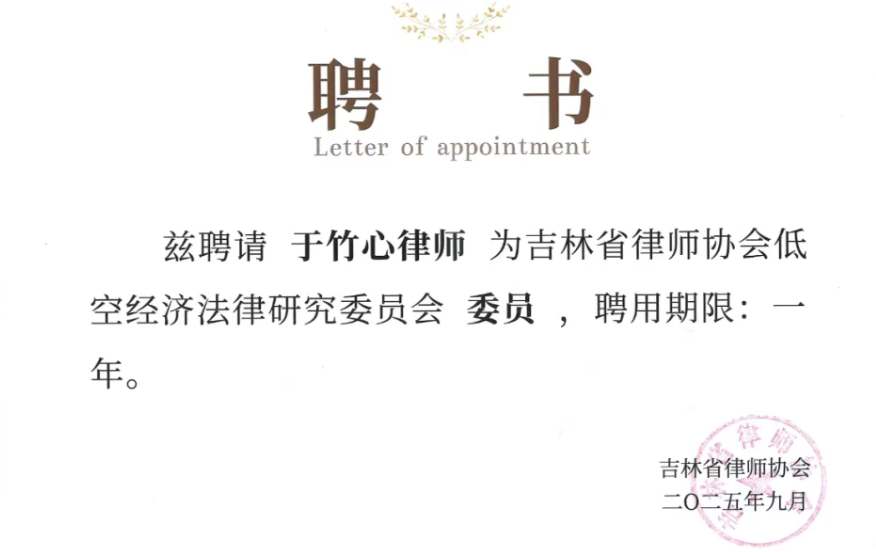 近日,吉林省律师协会低空经济法律研究委员会成立大会在长春新质生产力发展促进中心成功举办。低空经济法律研究委员会的成立,旨在汇聚法律界、产业界与学术界资源,构建“法律+科技+产业”协同创新平台,为低空经济高质量发展筑牢法治根基。大会公布了首批委员名单,功承瀛泰(长春)律师事务所主办律师于竹心凭借扎实的专业功底和丰富的实务经验,首批入选其中。